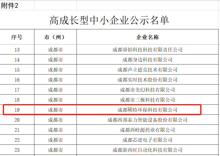 12月24日,由四川省經(jīng)濟(jì)和信息化廳組織的2020年度重點(diǎn)中小企業(yè)申報(bào)工作評(píng)選結(jié)束,成都碩特環(huán)保科技有限公司通過復(fù)核,進(jìn)入高成長型中小企業(yè)公示名單。