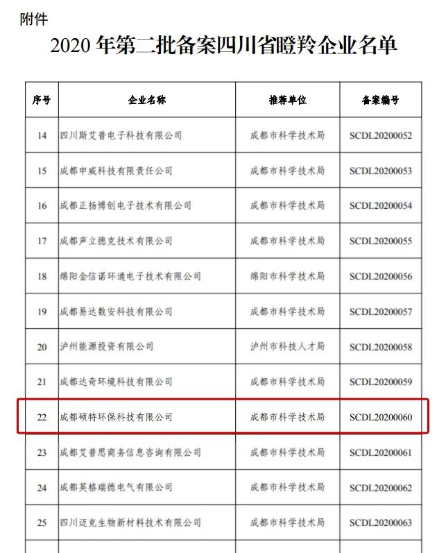 【喜報】碩特環(huán)保成功備案為四川省瞪羚企業(yè)