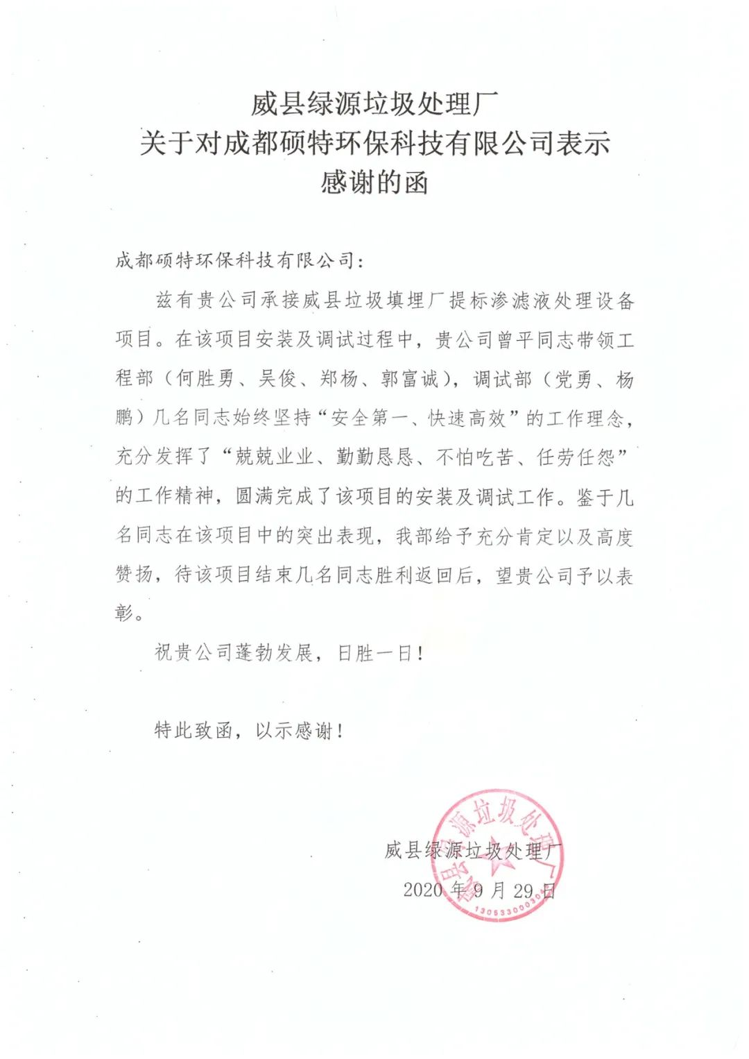 曾平半年來主持參與公司云南漢盟項目、河北威縣填埋場填埋區(qū)域雨污分流改造工程項目,參與貴陽比例壩垃圾填埋場滲濾液應(yīng)急處理項目、都昌縣生活垃圾焚燒發(fā)電項目滲濾液處理系統(tǒng)機電安裝工程,其中河北威縣項目得到了業(yè)主的一致好評,并向碩特環(huán)保發(fā)送感謝函。