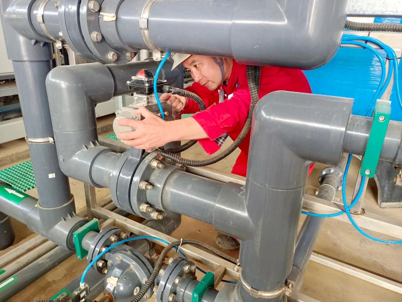 譚前師為了把工作干好迎難而上,工作期間氣溫零下20~30℃,2020年12月20日,當(dāng)晚由于溫度過低造成原水泵進水口結(jié)冰,為了不耽誤生產(chǎn),他帶領(lǐng)兄弟們堅持4小時不斷用熱水將原水泵澆通,消除故障;項目人員緊缺,譚前師同時兼任叉車司機,每天水處理系統(tǒng)產(chǎn)生的近8噸泥漿他都要在夜晚全部卸出。