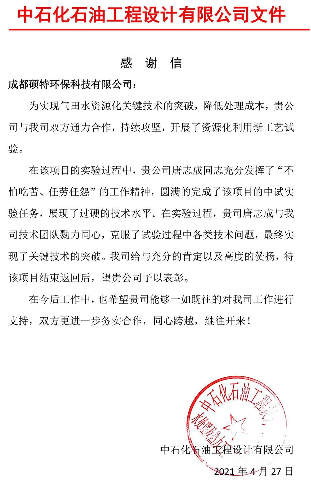 2020年12月入職至今,作為公司技術(shù)骨干,唐志成常駐試驗現(xiàn)場,積極配合中國石化技術(shù)團隊,主動深入技術(shù)研究,克服試驗過程中各類技術(shù)問題,有效降低處理成本,實現(xiàn)氣田水資源化關(guān)鍵技術(shù)的突破,2021年4月唐志成得到中石化石油工程設(shè)計有限公司的充分肯定和高度贊揚,值得公司各位同事學(xué)習(xí)!