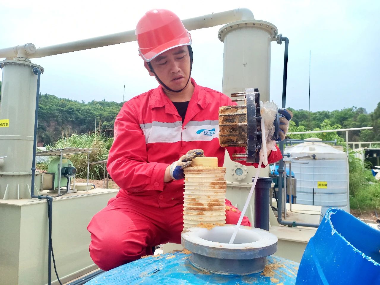 為了徹底解決設(shè)備砂濾罐換沙問題,最終決定在集裝箱頂部進(jìn)行開孔,而集裝箱供應(yīng)商不愿意協(xié)助開孔,此時(shí)陳昌波站了出來,接下了這個(gè)艱巨的任務(wù)。他立即制定方案,提出利用工廠的乙炔氣割進(jìn)行開孔,他有條不紊地安排人員分工,計(jì)算開口大小和切割順序并做好安全防護(hù)工作。最終在與團(tuán)隊(duì)成員緊密配合下,順利完成了換砂任務(wù)。