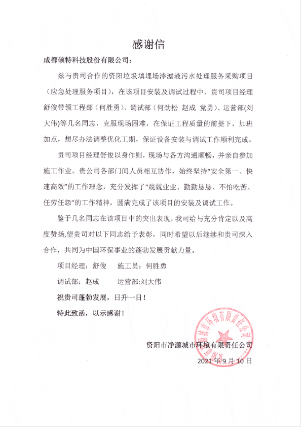 2021年2月,龐俊國帶領(lǐng)團隊配合運維、技術(shù)部門完成貴陽比例壩垃圾滲濾液應(yīng)急處理項目提標(biāo)改造竣工驗收并投入生產(chǎn);9月,積極響應(yīng)環(huán)保局要求,克服各種困難,完成在線檢測系統(tǒng)所有手續(xù),提前推進貴陽項目的竣工驗收并確保項目持續(xù)穩(wěn)定地生產(chǎn),得到業(yè)主一致好評!